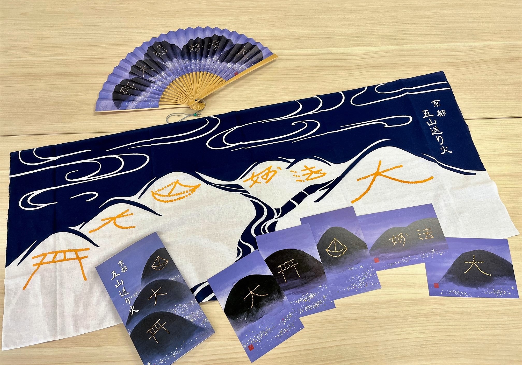 カテゴリ無し 7月29日より 五山送り火オリジナルグッズ販売開始です 扇子 1本 ¥2,500(税込) 絵はがき(1セット5枚入) ¥200(税込) 手ぬぐい 1本 ¥800(税込)※事前のご予約はお受けできません。