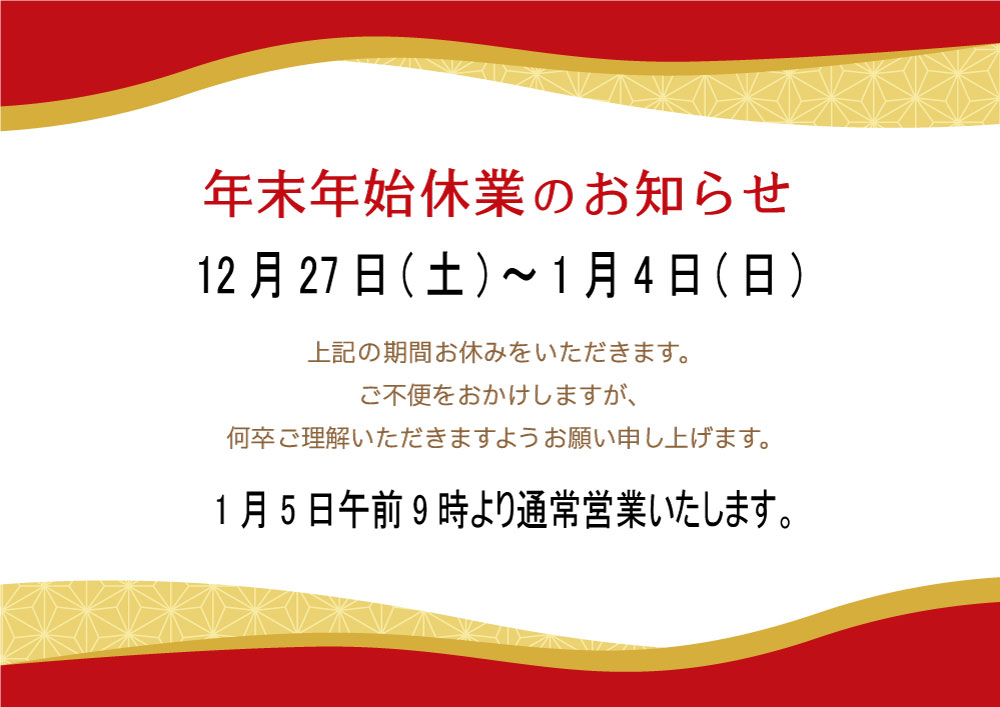 12月26日(金)が今年最後の営業日となります。皆様にはご不便、ご迷惑をおかけいたしますが、何卒ご理解賜りますようお願い申し上げます。